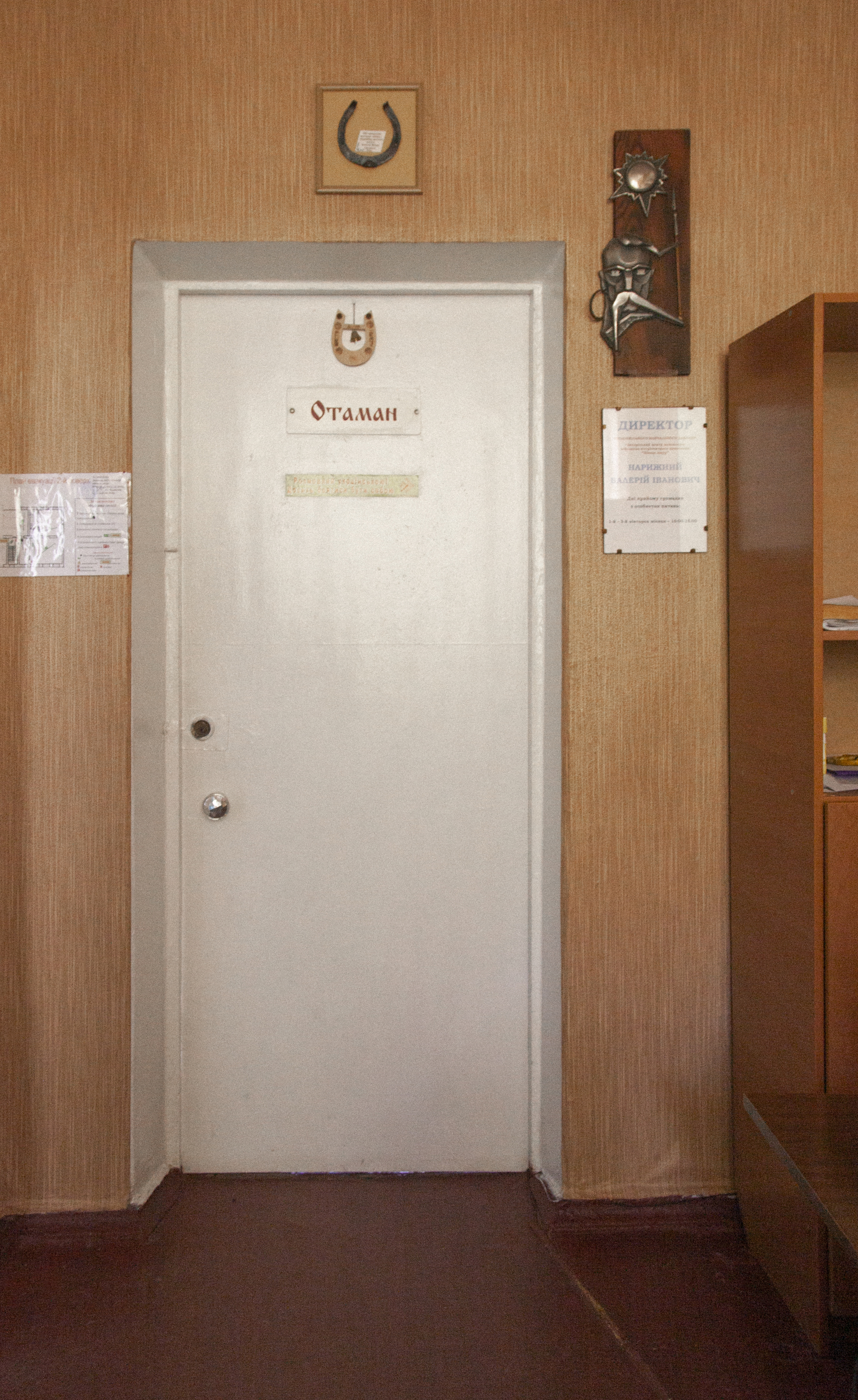 The school principal’s office, ШКОЛА ДЖУР School of Cossack Army-Patriotic Education. The sign on the front door says—Отаман, which was the official term used for the supreme military commanders of the Cossack army.